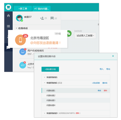 通過人工客服工作臺(tái)自定義的快捷回復(fù)內(nèi)容,客服可以一鍵推送內(nèi)容給客戶,清晰的會(huì)話提示、超時(shí)提醒、未讀消息等,使得企業(yè)客服能一目了然的掌握服務(wù)動(dòng)態(tài),并以 快的速度響應(yīng)用戶。