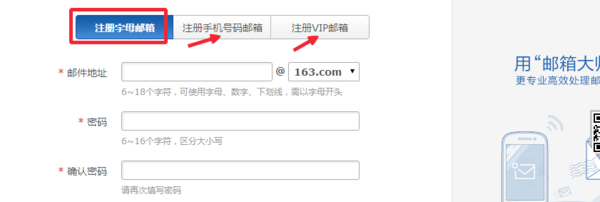3、點(diǎn)擊后進(jìn)入網(wǎng)易郵箱注冊(cè)頁(yè)面,其中有注冊(cè)字母郵箱、注冊(cè)手機(jī)號(hào)碼郵箱、以及VIP郵箱,我們可以根據(jù)需要任選其一,例如注冊(cè)字母郵箱;